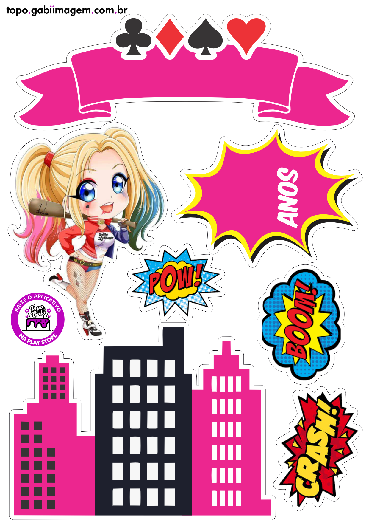 Com suas cores vibrantes em vermelho, azul e preto, além de elementos icônicos como cartas de baralho e o famoso taco de beisebol, o topo de bolo traz a essência da personagem para a sua festa.