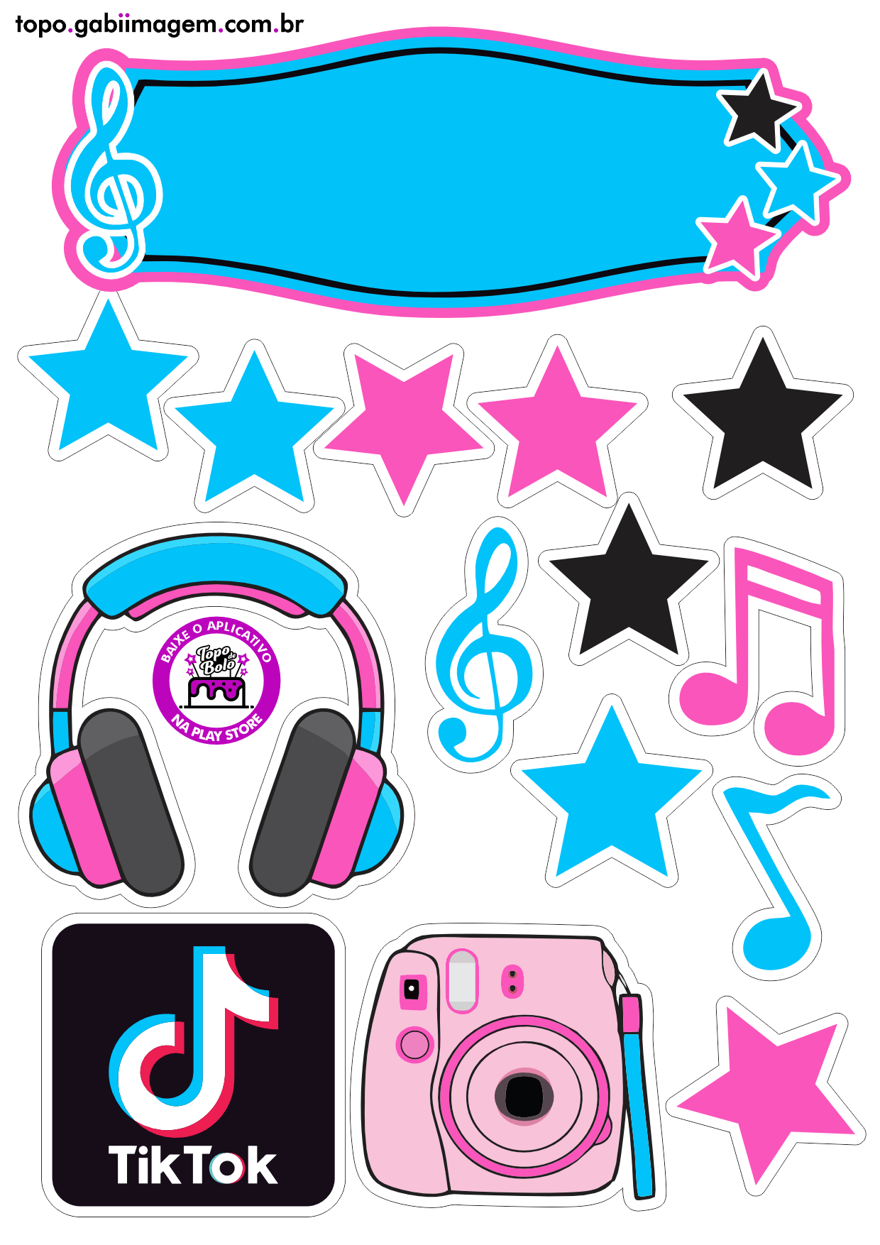 Nosso topo de bolo tema TikTok foi projetado para ser fácil de usar e imprimir. Aqui estão as especificações: