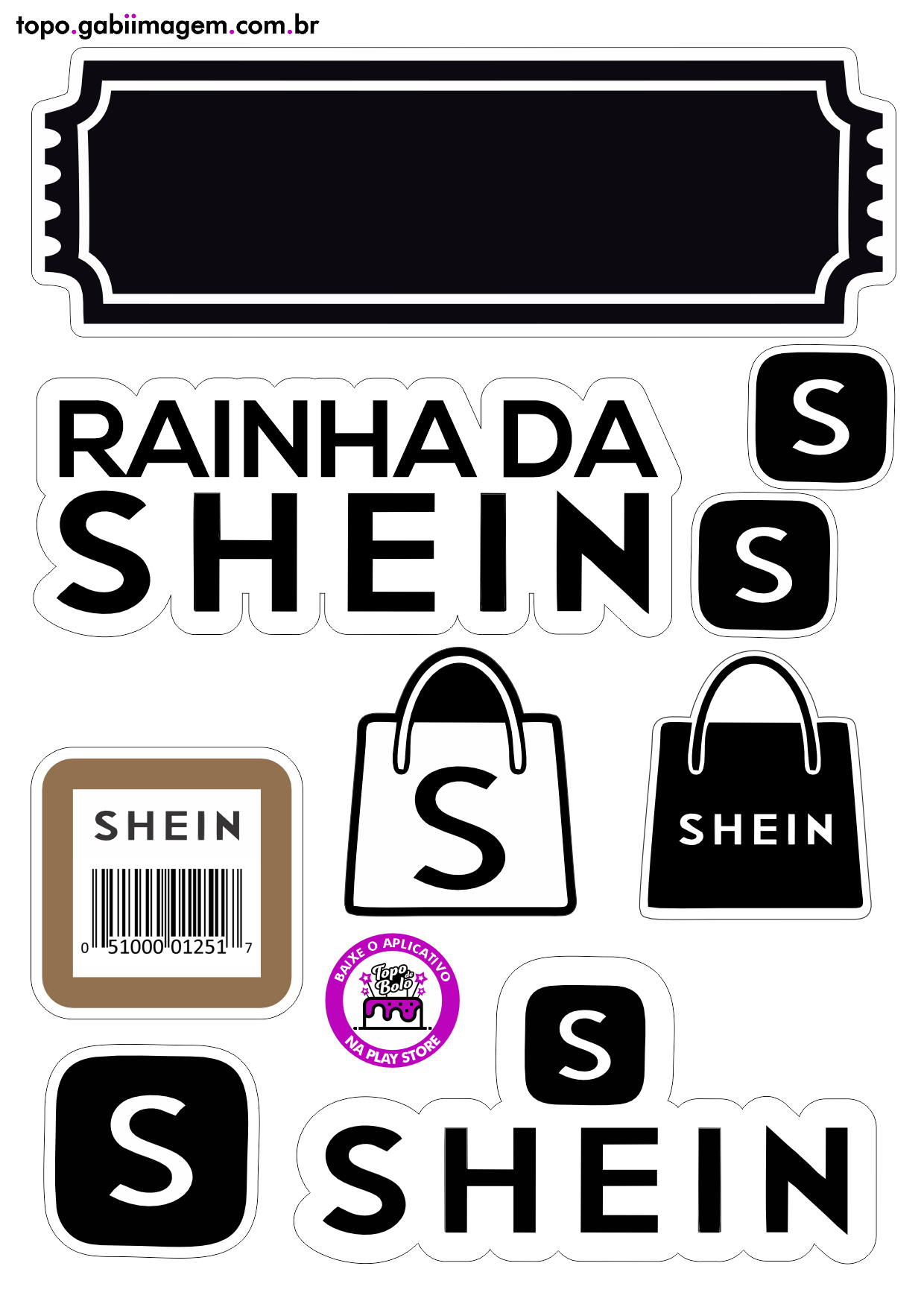 A arte de topo de bolo é um arquivo digital, criado para ser impresso e utilizado na decoração do bolo. Com um design exclusivo e moderno, o tema SHEIN é ideal para festas que seguem o universo fashionista, combinando perfeitamente com uma decoração cheia de estilo.